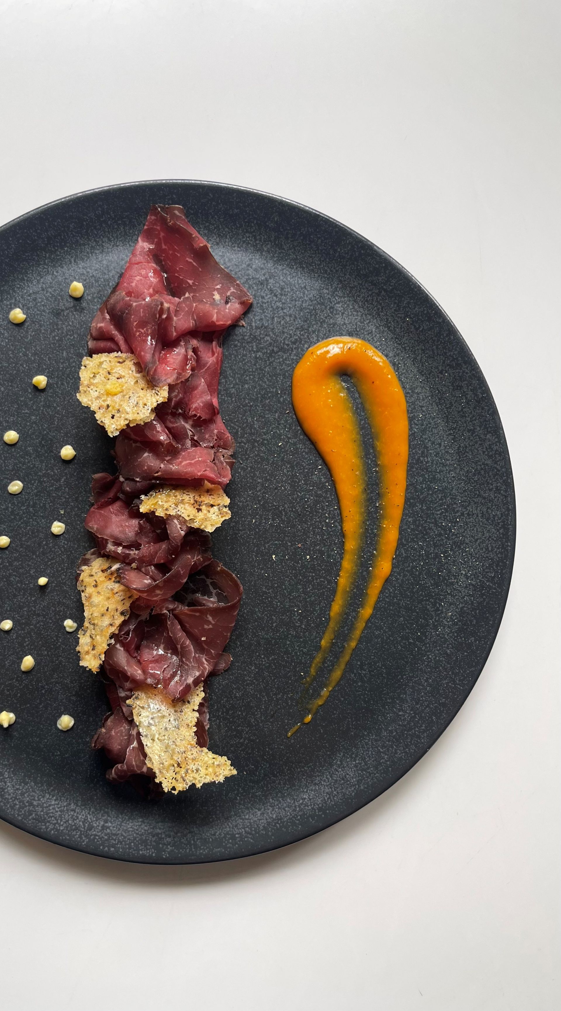 Bresaola di Black Angus selezione Brisval, purea di albicocca, burro salato e cialda di Parmigiano Reggiano all’erba cipollina