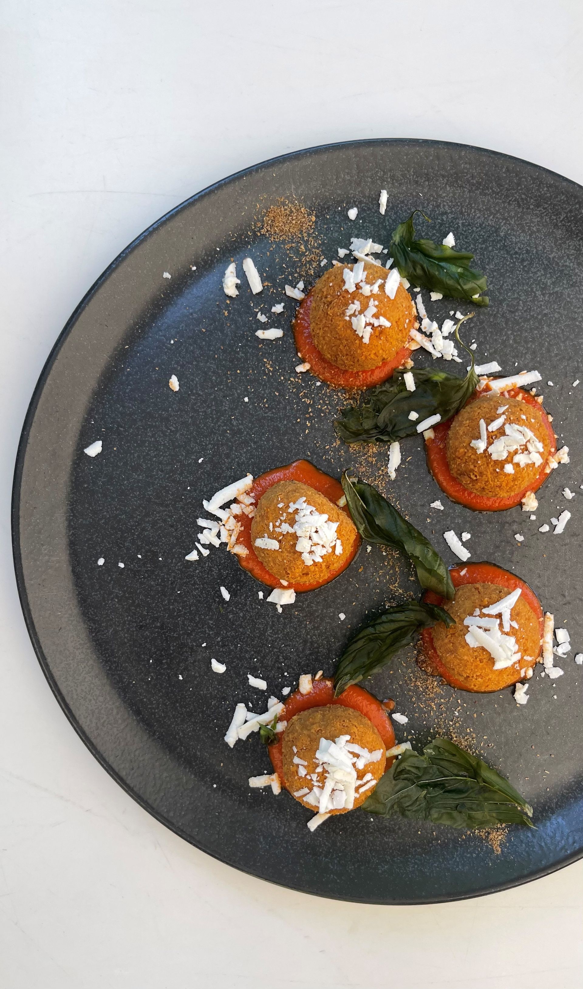 Crocchetta di ceci e coriandolo, crema di pomodoro, ricotta salata e basilico croccante